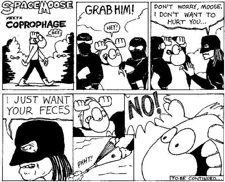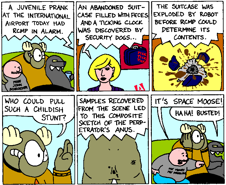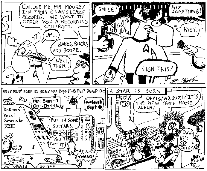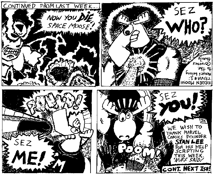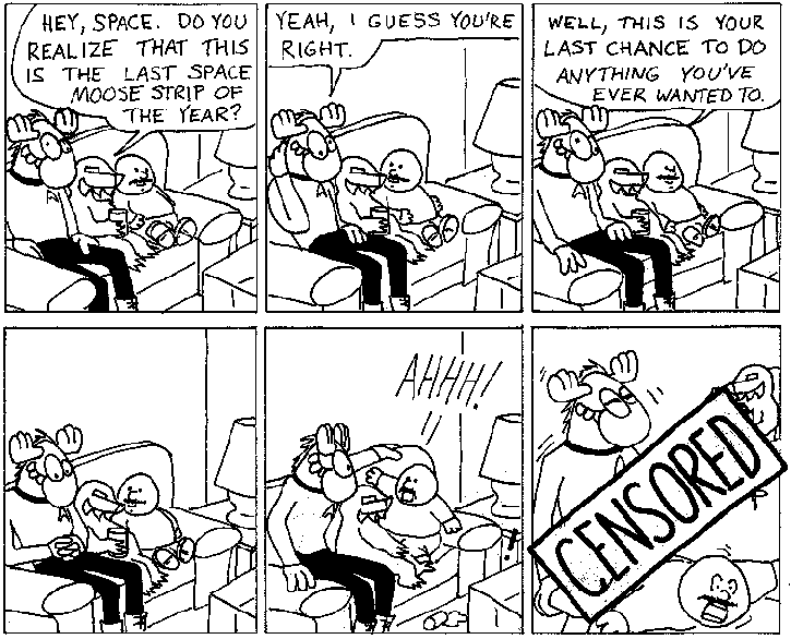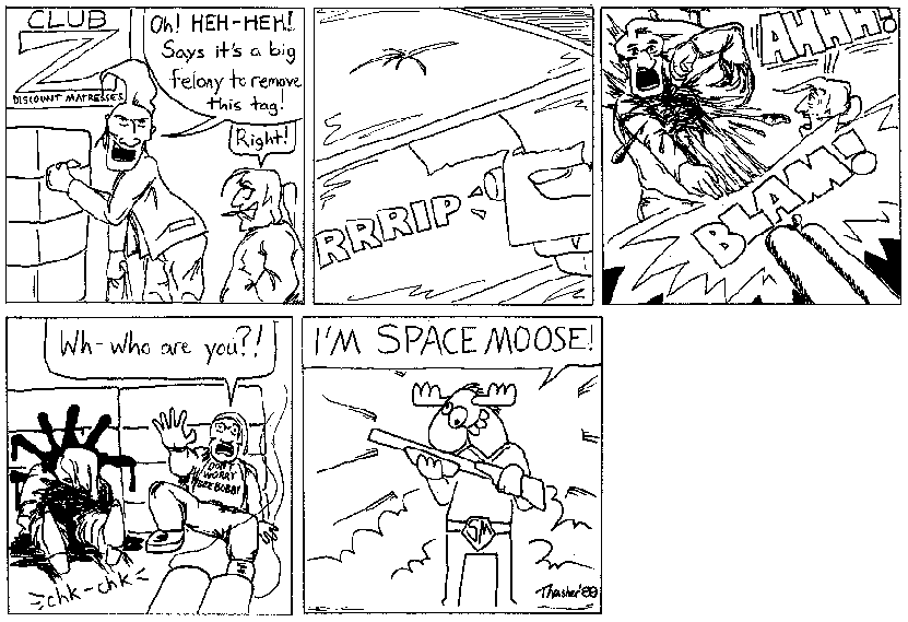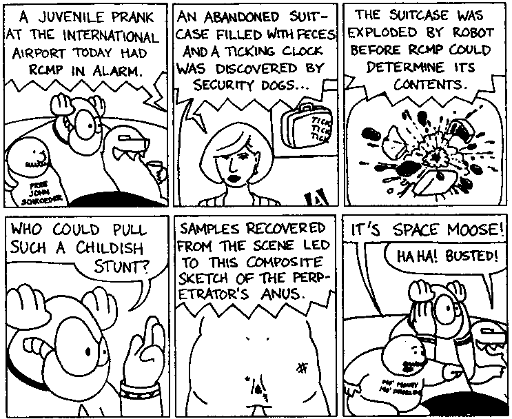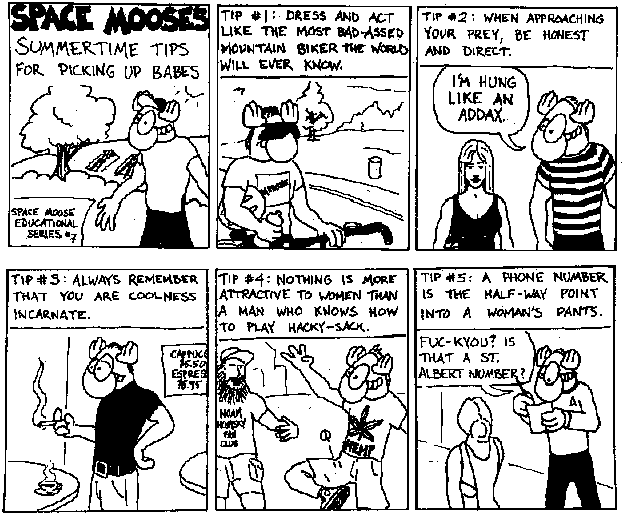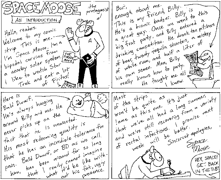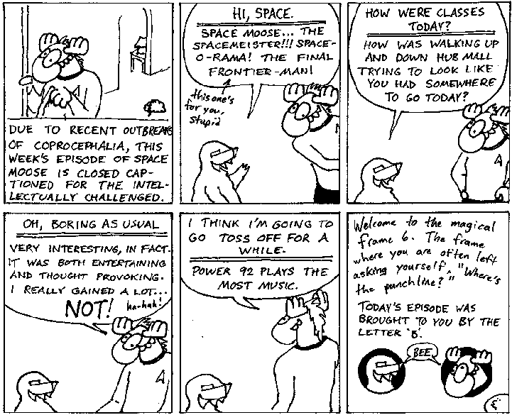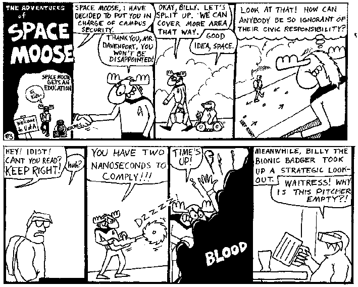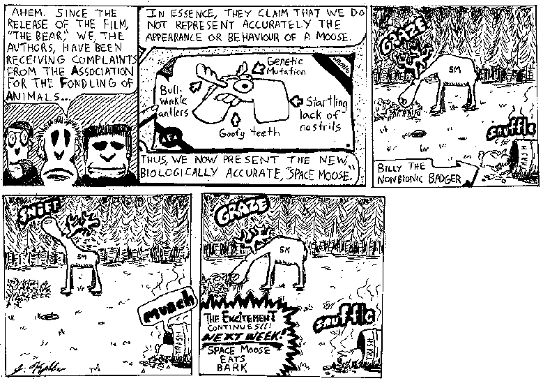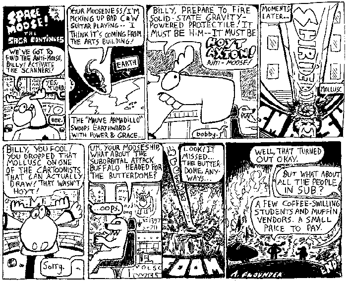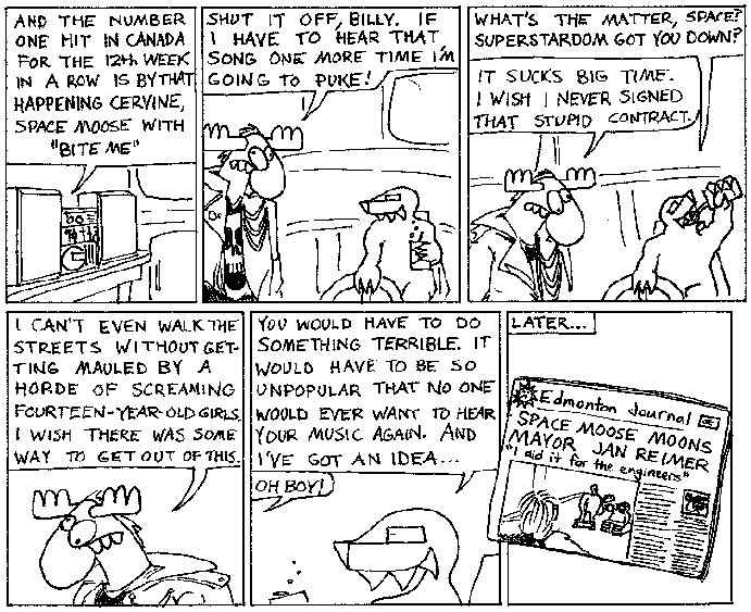 Space Moose appeared in the University of Alberta's student newspaper "The Gateway" from 1989 to 1999. Space Moose is owned by Adam Thrasher, and he will not deny it despite legal counsel.