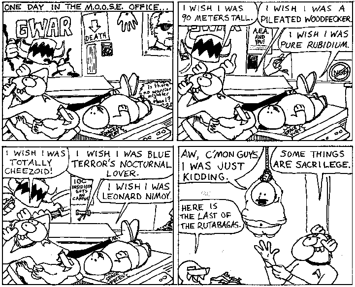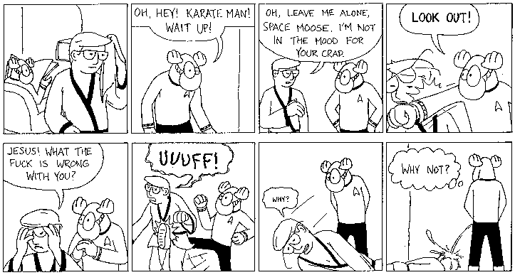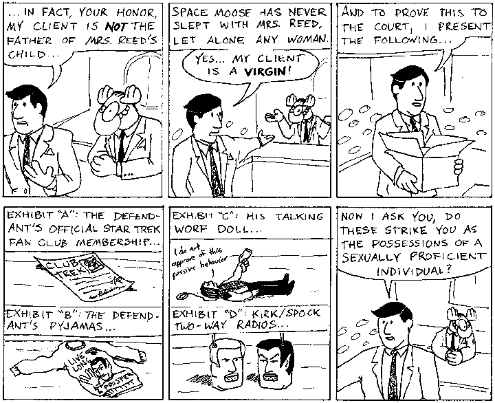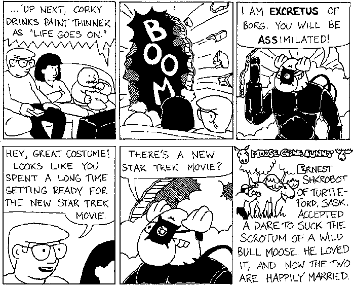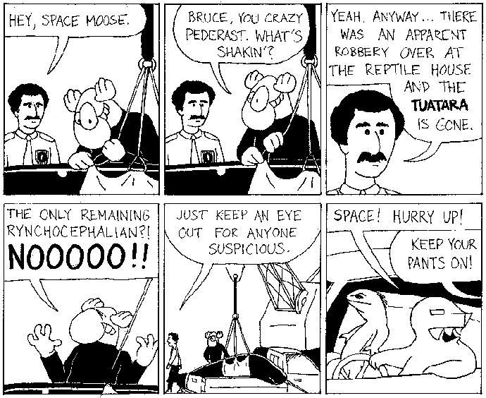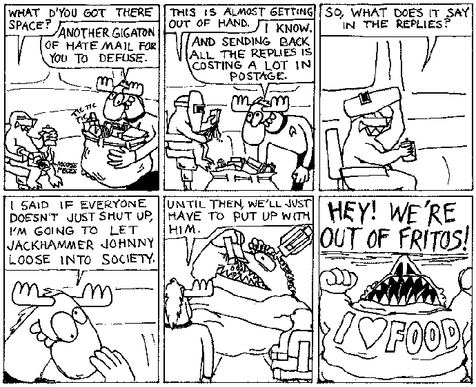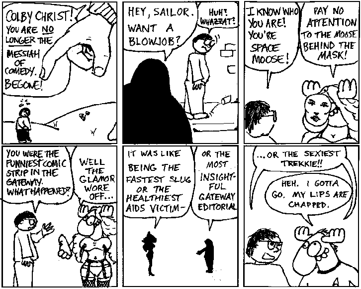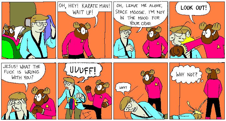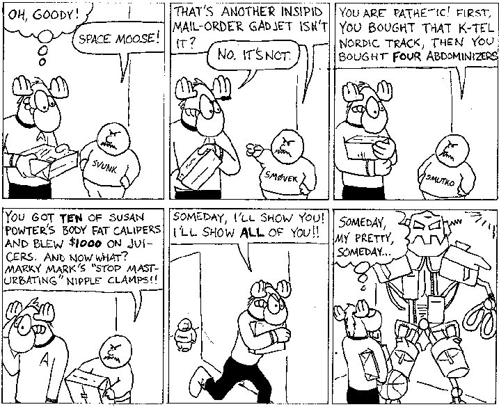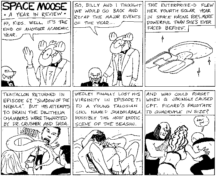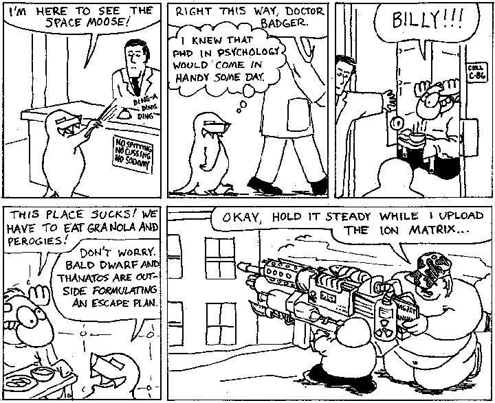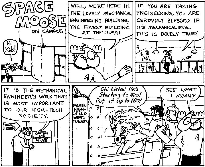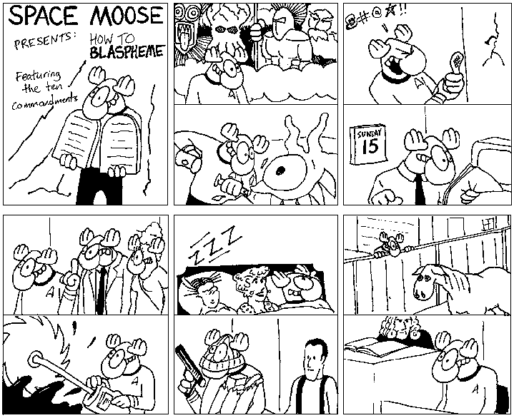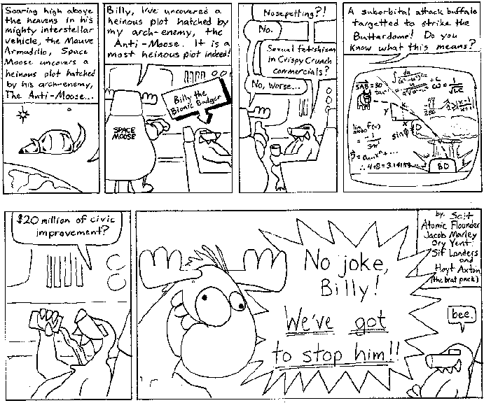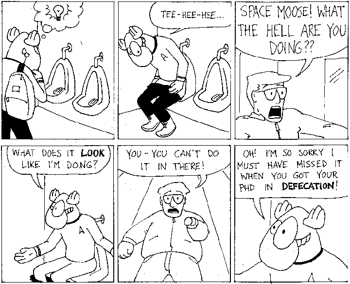 Space Moose appeared in the University of Alberta's student newspaper "The Gateway" from 1989 to 1999. Space Moose is owned by Adam Thrasher, and he will not deny it despite legal counsel.